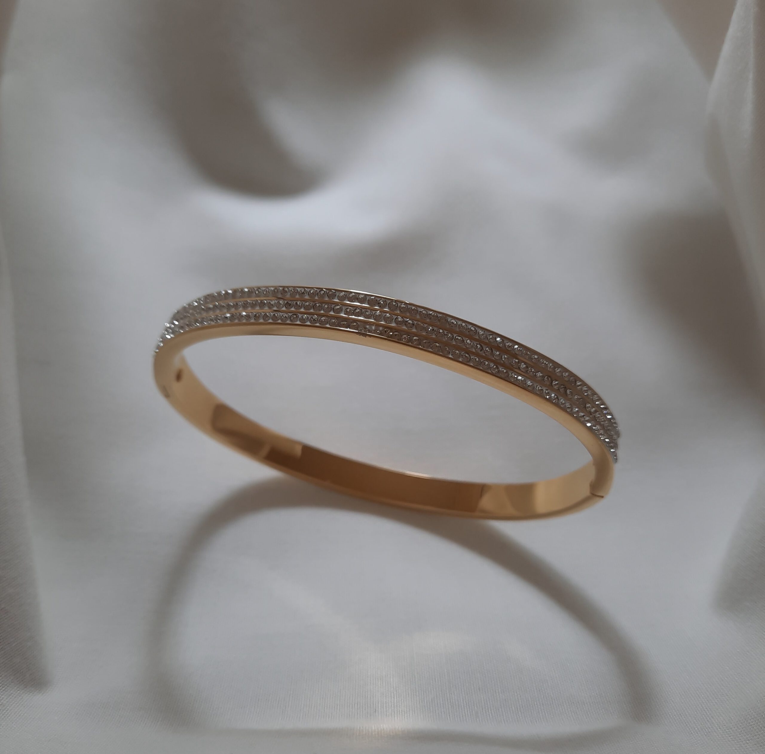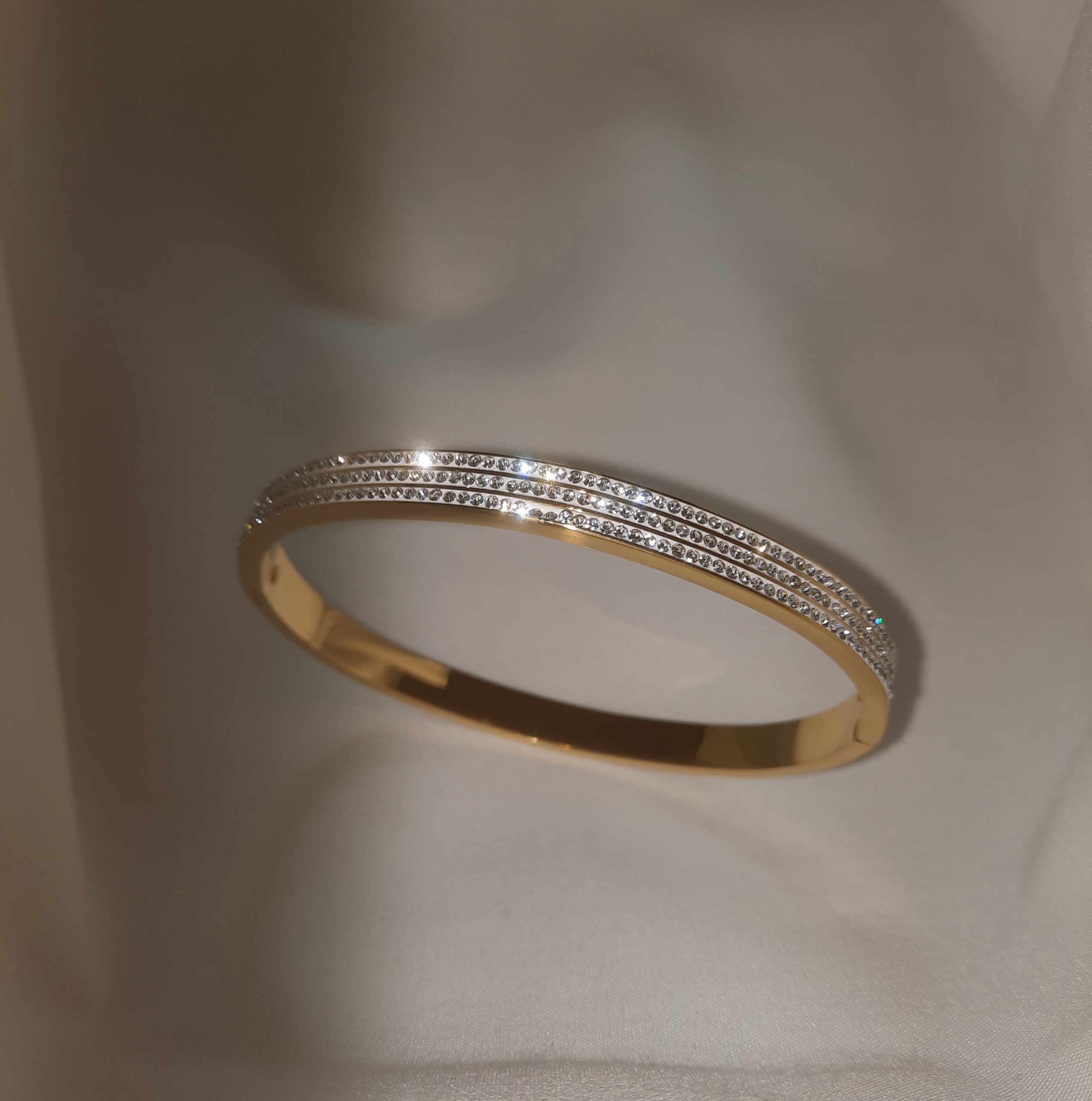 Añade un toque de sofisticación y brillo a tu muñeca con esta deslumbrante pulsera rígida. Su elegante acabado dorado sirve de base perfecta para las múltiples filas de circonitas brillantes que capturan la luz con cada movimiento. Esta pulsera, moderna y a la vez atemporal, es ideal para realzar tanto looks de diario como conjuntos para ocasiones especiales. Su diseño rígido asegura un ajuste cómodo y seguro. ¡Una pieza imprescindible para quienes buscan un accesorio que combine elegancia y luminosidad!