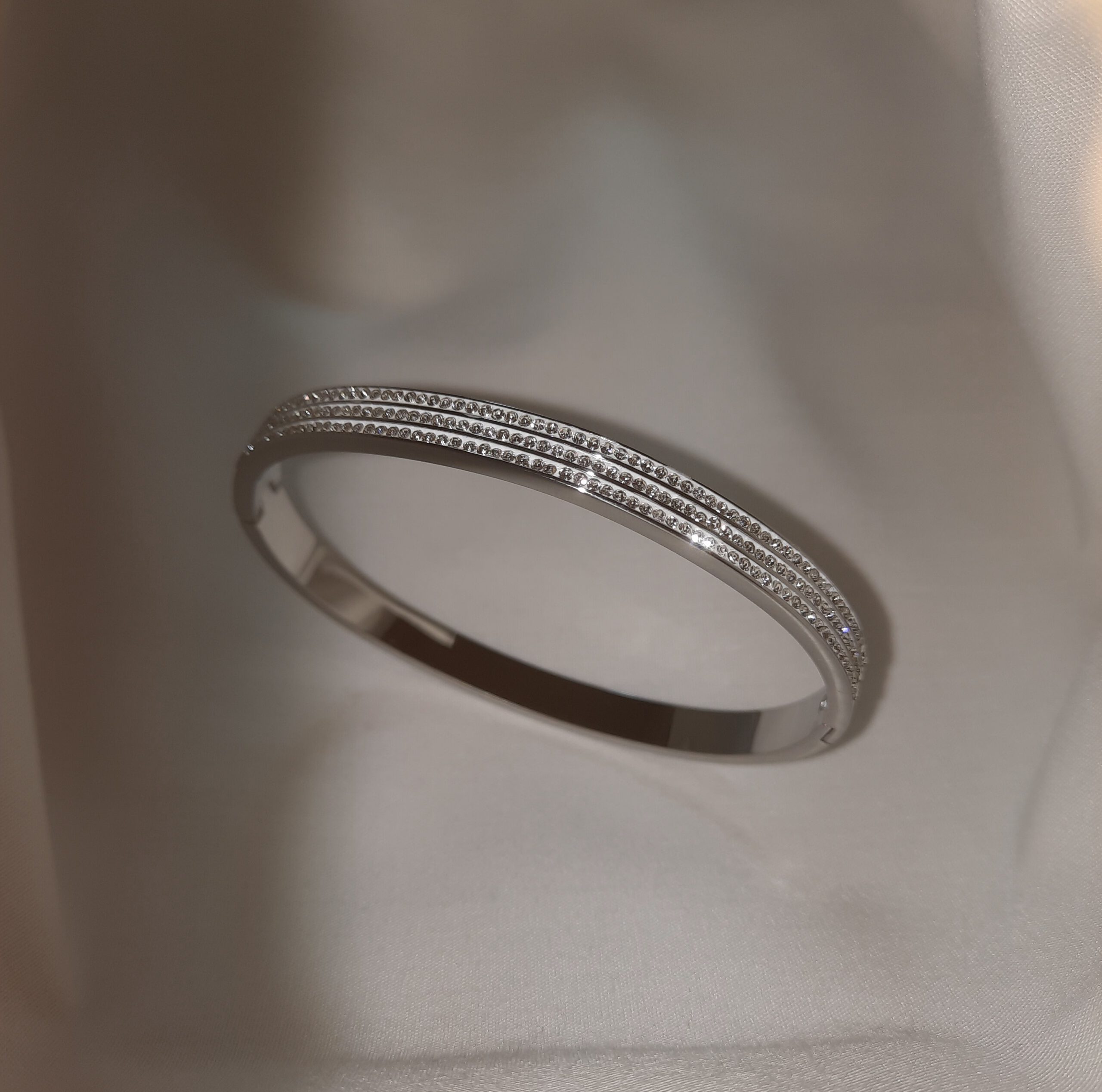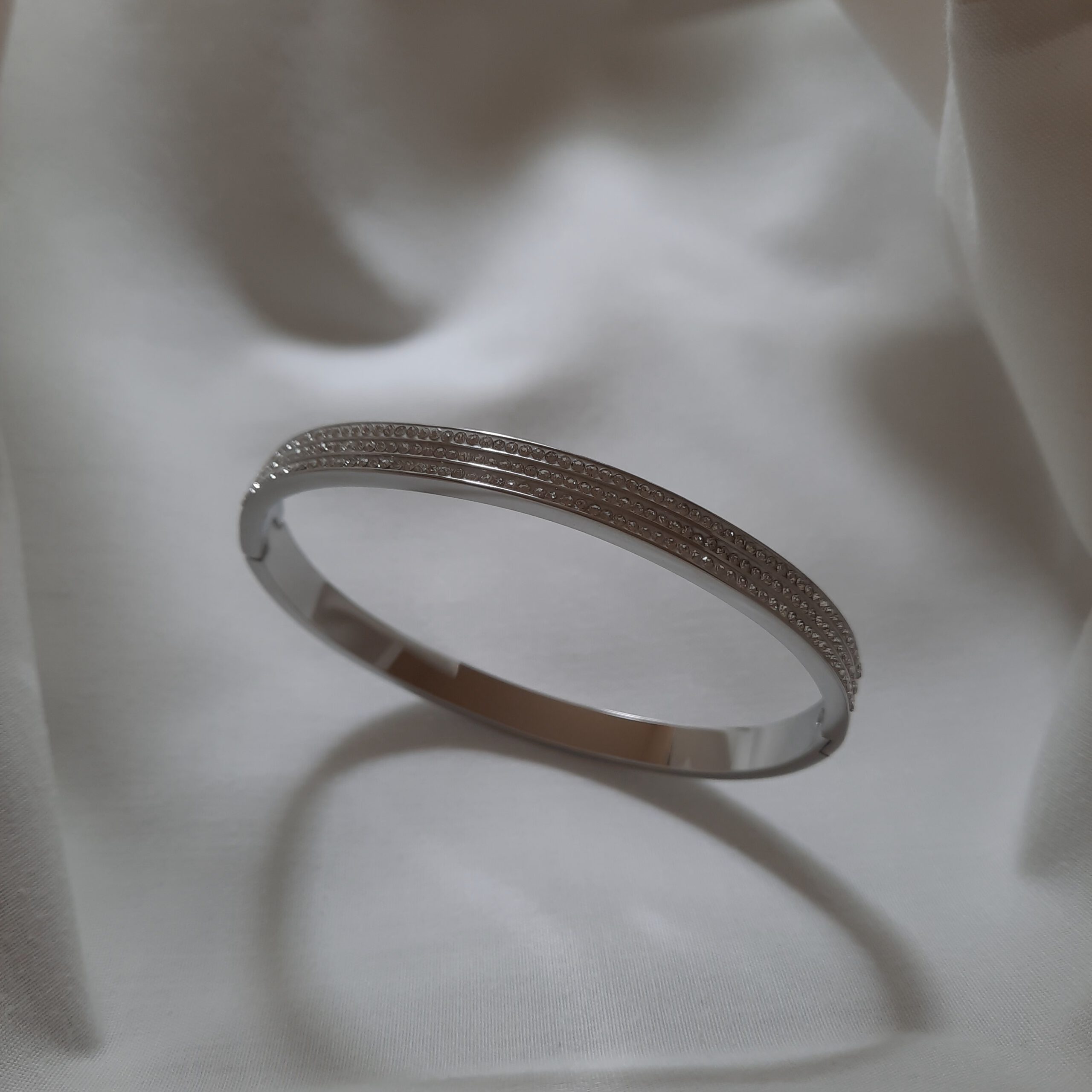 Añade un toque de sofisticación y brillo a tu muñeca con esta deslumbrante pulsera rígida. Su elegante acabado plateado sirve de base perfecta para las múltiples filas de circonitas brillantes que capturan la luz con cada movimiento. Esta pulsera, moderna y a la vez atemporal, es ideal para realzar tanto looks de diario como conjuntos para ocasiones especiales. Su diseño rígido asegura un ajuste cómodo y seguro. ¡Una pieza imprescindible para quienes buscan un accesorio que combine elegancia y luminosidad!